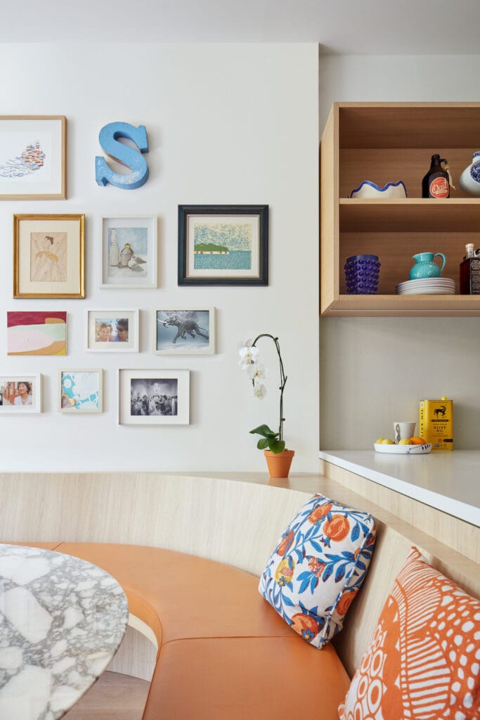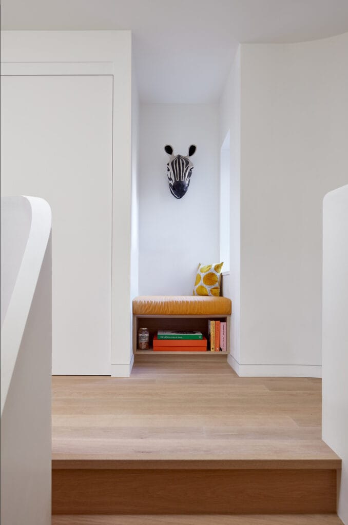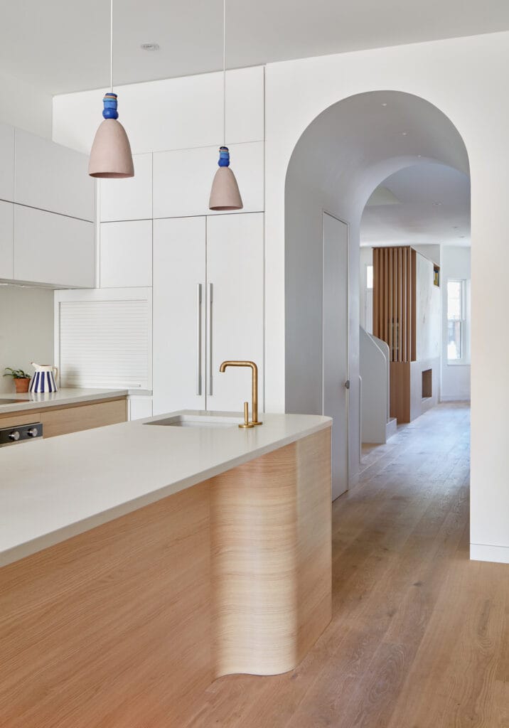 The team at Dubbeldam Architecture + Design embraced curved forms throughout the house, with arched openings between rooms sparking curiosity by anticipating views of what lies beyond. These elements marry with curved walls, display niches, the kitchen island, and bench, further emphasizing the sculptural approach of the entire project.