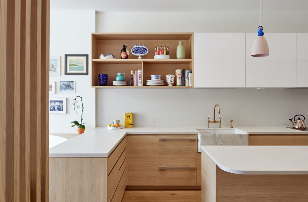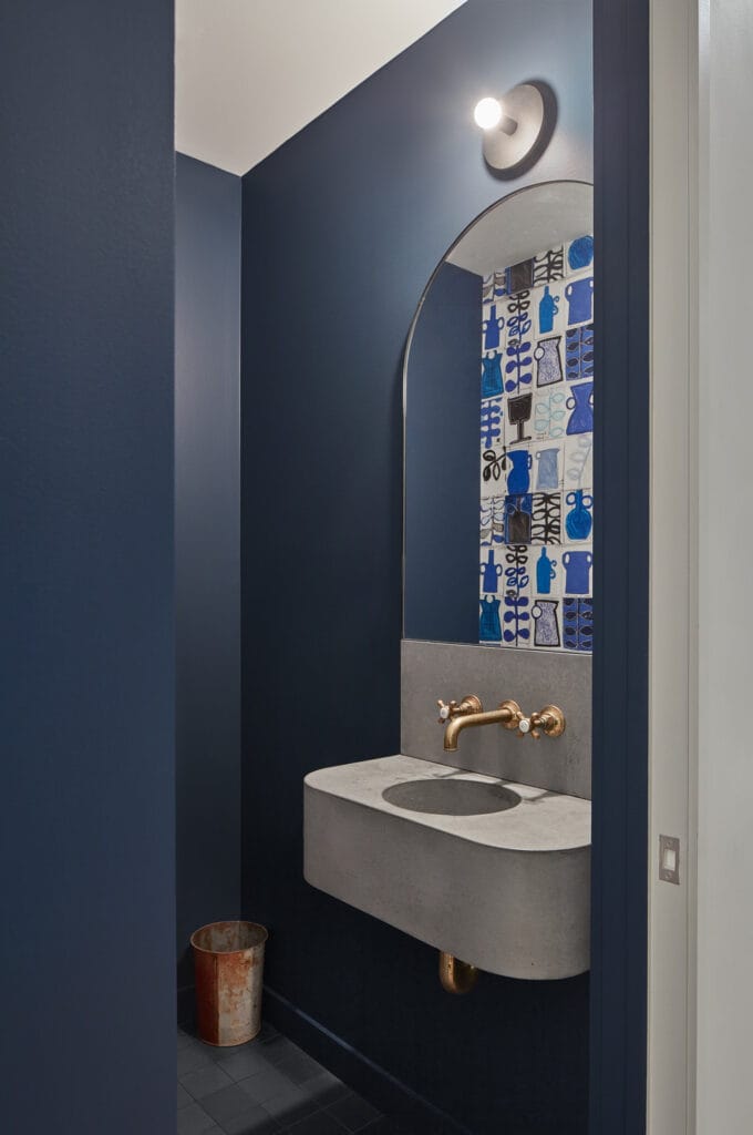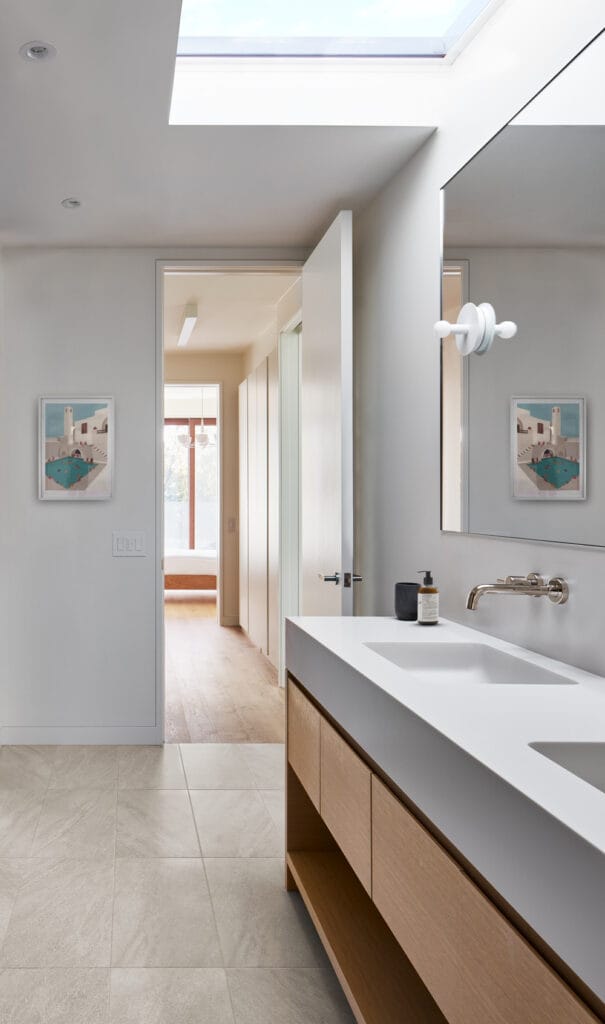 A key aspect of the design was a nod to one of the owners’ professions, a ceramicist. The idea of tactility and craftsmanship permeates the environment through the use of materials, shapes, patterns, and textures. The combined influence of Scandinavian and Mediterranean styles is reflected in white oak wood furniture, screens, and floors, paired with concrete and Carrara marble sinks, refined antique brass accessories, and handcrafted ceramic lamps. A white-based environment with walls and shelves provides a blank canvas for displaying a family collection of art, tapestries, and sculptures created by local artists, along with artifacts collected during trips abroad and the owner’s ceramics. Colors enliven the interstitial spaces of the house: herringbone terracotta tiles adorn the entrance, while a cerulean blue geometric tile wall defines the bar area between the kitchen and dining room.