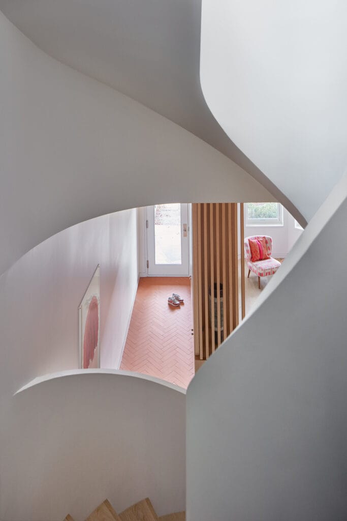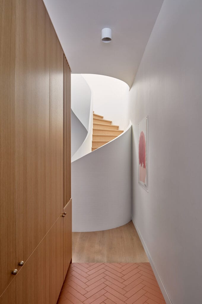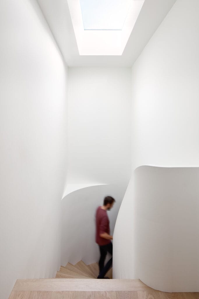 The interior design features fluid lines, contrasting with the rectangular footprint of the house, giving the interior elements a sculpted rather than constructed appearance. The spiral staircase that connects all four floors is a focal point that expresses the sense of flow in the house, illuminated by natural light from the skylight, the sinuous railing, and natural oak steps casting shifting shadows during the day.