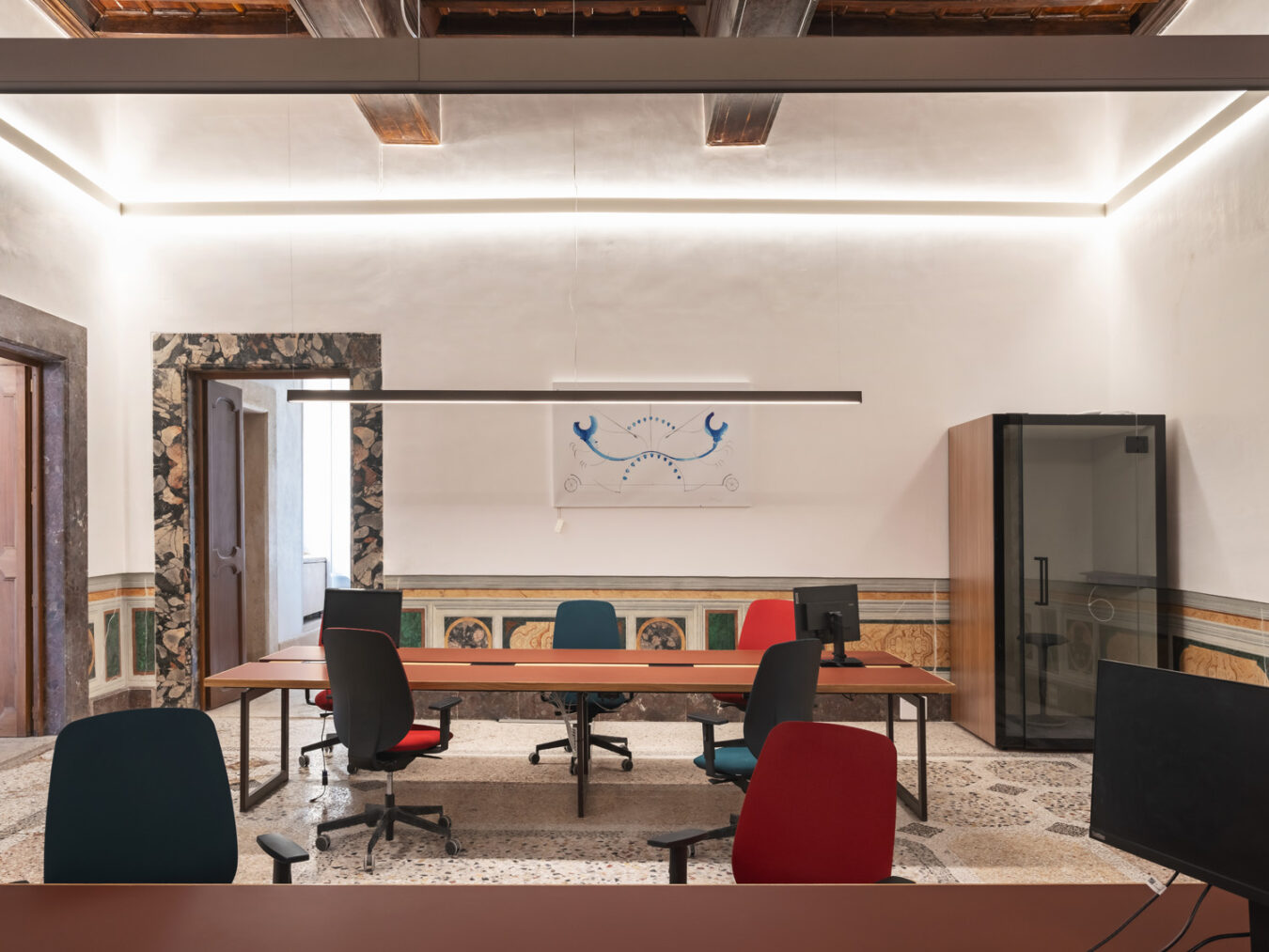 The new Hyntelo offices were designed by architect Valentina Andriulli with the goal of creating functional, contemporary workspaces while respecting the identity of the place. The project focused on enhancing the building’s original architectural elements — terrazzo floors, decorated or exposed-beam ceilings, marble moldings — pairing them with essential furnishings, technological devices, and a layout conceived to allow for a high degree of tech-typological flexibility.