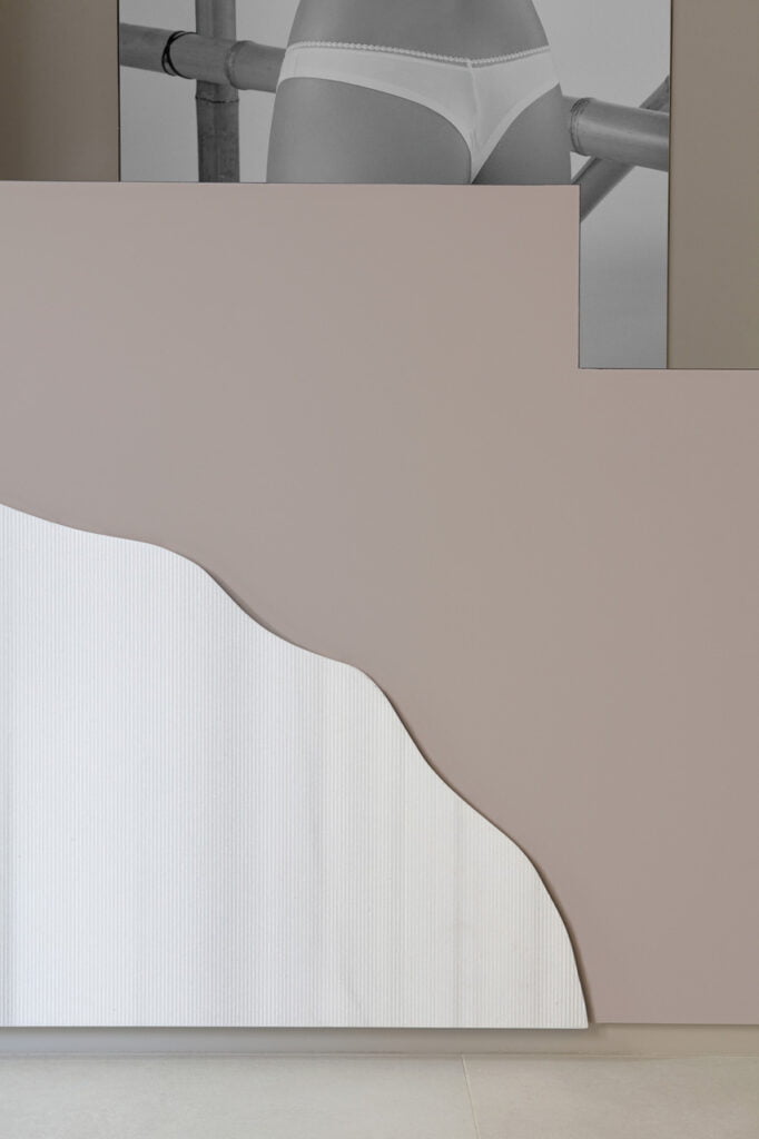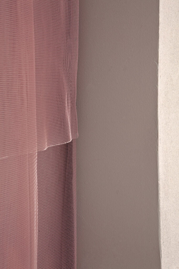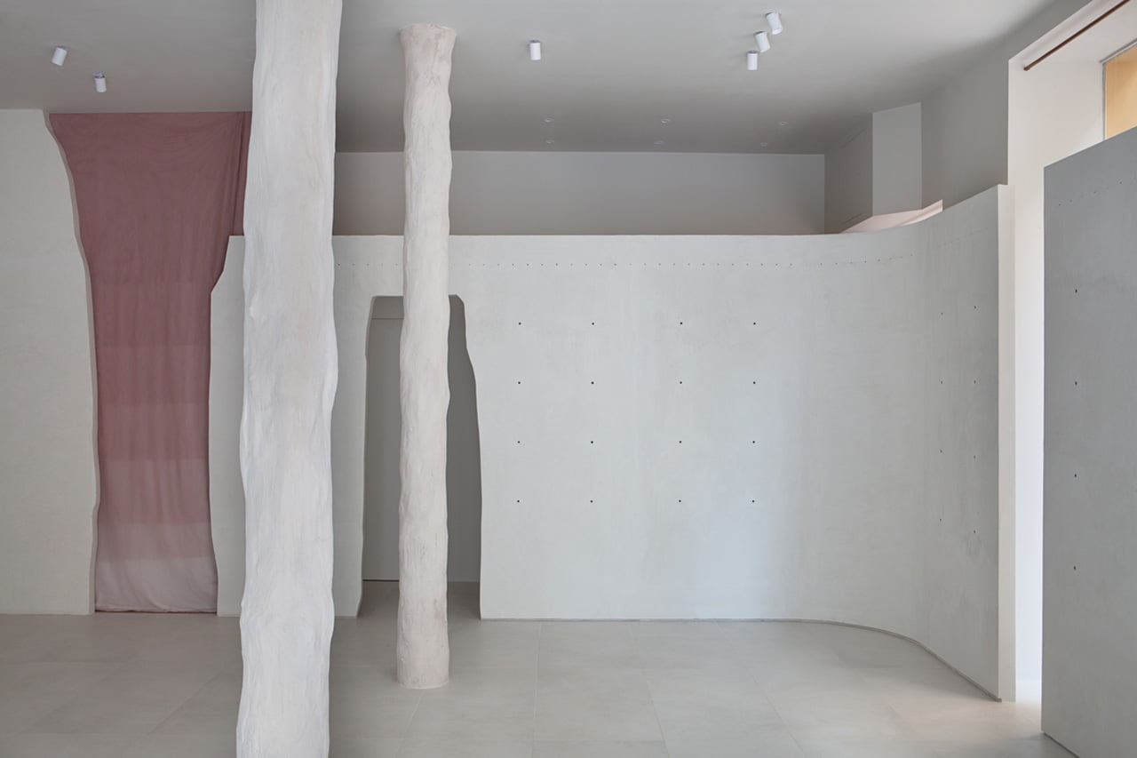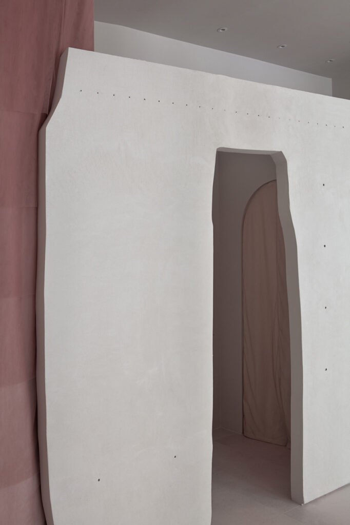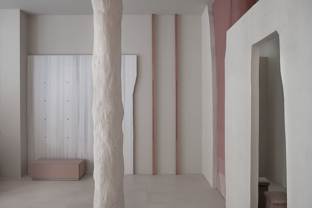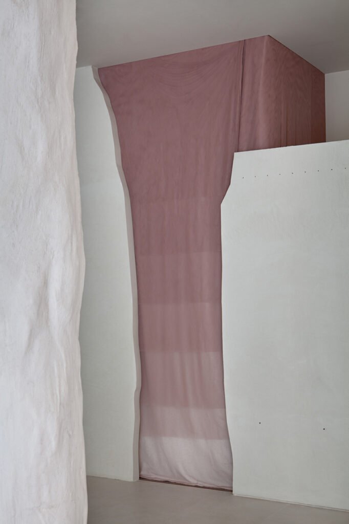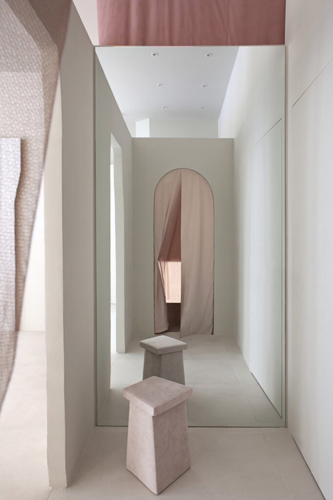 The fitting room handmade curtains are produced by overlapping several layers of make-up colored tulle, thus generating an optical effect of transparency. Vermiculite columns have been treated with plaster, the goal was to create an unexpected experience that conveyed beauty through a random like natural sensuality.