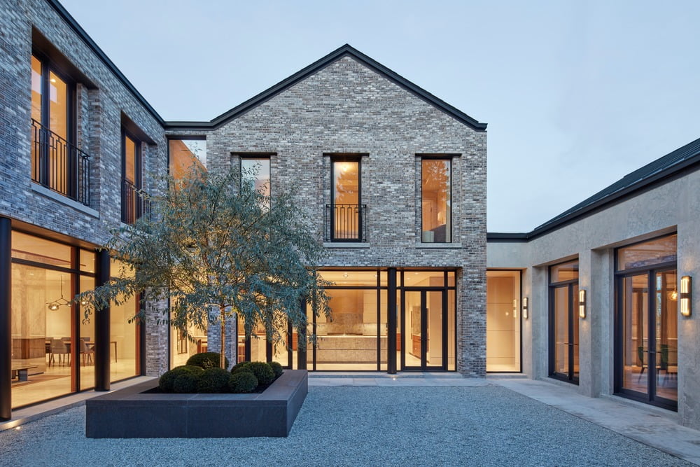 White-washed brick is balanced with elegant Hope Bay limestone to achieve a refined texture on the façade. The lower roofs are rendered in standing seam zinc, while the upper roofs are in slate.